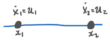 $$\array{ x_1 = p &&& \dot{x}_1 = x_2 \\ x_2 = \dot{p} &&& \dot{x}_2 = u }$$Tenemos que la derivada de la posición ($x_1$) es la velocidad $\dot{x}_1 = x_2$ y que la derivada de la velocidad ($x_2$) es la aceleración $\dot{x}_2=u$, el estado del sistema es "2-dimensional":