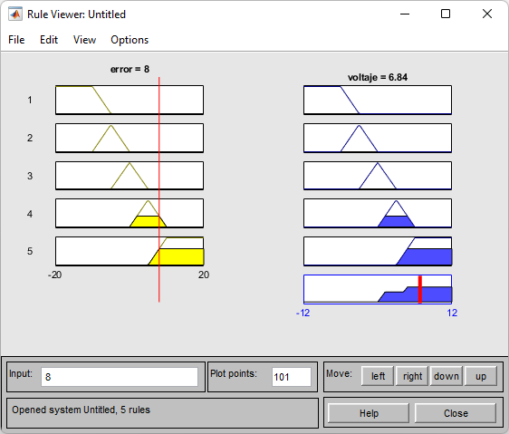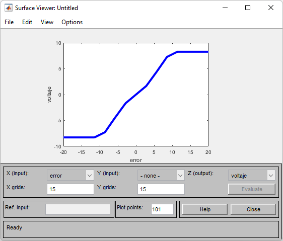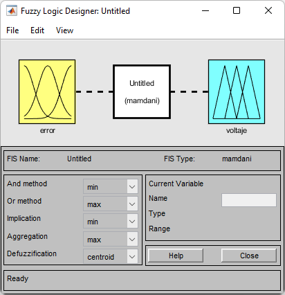 Esta es la ventana inicial, donde definiremos la variable de entrada como el error y la variable de salida como el voltaje.